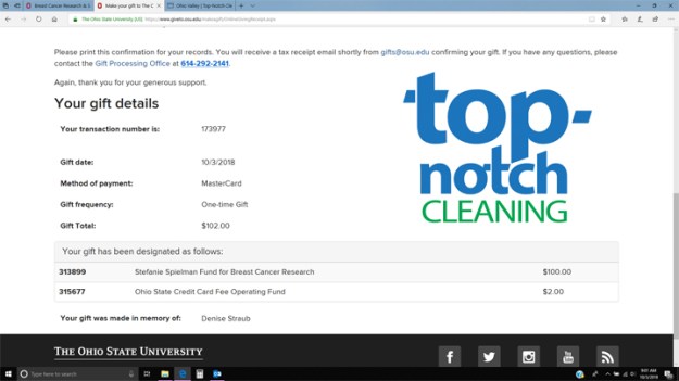 In honor of Breast Cancer Awareness Month and all of the wonderful ladies on our staff please join Top-Notch Cleaning in making a donation to the Stefanie Spielman Fund for Breast Cancer Research.