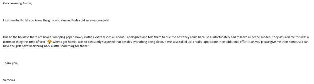 Reading a thrilled client review in my email is a great way to start a Monday morning. THANK YOU Veronica and we will for sure track down who was the cleaners on your cleaning this past week.