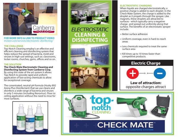 The Check Mate Electrostatic Cleaning System from Canberra Corporation allows Top-Notch Cleaning to provide rapid, uniform application of fast-acting chemicals to allow for exceptional coverage – using chemicals that boast kill times times faster than competitive products.