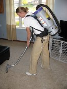 The equipment utilized is a triple filtered backpack system, along with a bucketless mop for bigger jobs.